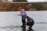 Description :DEBOUT SUR LA MINCE GLACE DE LA RIVIERE MAGOG, DEUX PECHEURS, SYLVAIN GOUDREAU ET YVES BOLDUC, RETIRENT UN PETIT POISSON DE L'EAU.