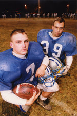 Description :LES COEQUIPIERS DE CLARK STEWART DES COUGARS DU COLLEGE CHAMPLAIN; ;A GAUCHE REAL BOUCHARD ET A DROITE KEVIN WEIR.