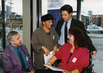 Description :LA COMEDIENNE ANDREE BOUCHER ET SON MARI JEAN-PIERRE BELANGER POSENT AVEC MAURICE LAMONTAGNE A GAUCHE, PRESIDENT DE LA SECTION ESTRIE, ET NICOLE BESSETTE A DROITE, VICE-PRESIDENTE AU NIVEAU PROVINCIAL. ILS SONT A L'INTERIEUR DE LA CIBC. A L'AR...