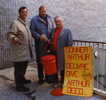 Description :RUE WELLINGTON NORD. DEVANT UN SEAU POUR RECUEILLIR DES FONDS, TROIS HOMMES: UN NON IDENTIFIE SONNE LA CLOCHE, GERARD BESSETTE REMET UN CHEQUE ET ARTHUR LAFOREST RECOIT LE CHEQUE.
