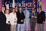 Description :DE GAUCHE A DROITE: BERTRAND BOLDUC, DIRECTEUR DU PROJET CHEZ SERVIER-CANADA, PATRICIA LEMELIN, TANIA VINCENT, STEPHEN GOUGHT, SYLVAIN GAGNON, MARC GAGNON, TOUS MEMBRES DE L'EQUIPE CANADIENNE DE PATINAGE DE VITESSE COURTE PISTE, L'ENTRAINEUR-C...