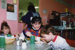 Description :ANDREA PARE ET SES ENFANTS TANIA ET TOMMY PRENNENT UN REPAS A LA GARNDE TABLE.