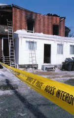 Description :PHOTO D'UNE MAISON A 2 ETAGES DONT LE HAUT EST BRULEE. UN RUBAN JAUNE INDIQUE: "BARRAGE DE POLICE - ACCES INTERDIT".