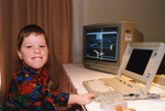 Description :LE JEUNE SIMON BELISLE ASSIS FACE A L'ORDINATEUR QUE LES AMPUTES DE GUERRE LUI ONT DONNE.