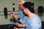 Description :PHOTO PRISE DANS UNE SALLE DE CONDITIONNEMENT PHYSIQUE. SUR LA PHOTO, CARL FLEURY ET PASCAL TREPANIER DES FAUCONS S'ECHANGENT LEURS CARTES DE HOCKEY ENTRE EUX.