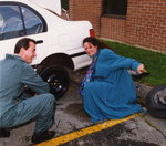 Description :VERONIQUE TREMBLAY, DIRECTRICE-ADJOINTE A LA PUBLICITE DE LA TRIBUNE SE FAIT AIDER DE SON ANCIEN PATRON GILLES BOISJOLY POUR METTRE SA ROUE DE SECOURS.
