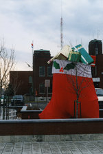 Description :GRAND BAS DE NOEL ROUGE AVEC PLUSIEURS CADEAUX SUR LE DESSUS. A L'ARRIERE DU BAS, L'HOTEL DE VILLE DE DRUMMONDVILLE.
