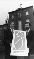 Description :DEUX HOMMES PRENNENT LA POSE. A GAUCHE, YVES D'AMBOISE, DIRECTEUR GENERAL DU CENTRE JEUNESSE ESTRIE. A DROITE, JEAN BELHUMEUR, PRESIDENT DU CENTRE. ILS PRESENTENT LE NOUVEAU LOGO DE L'ORGANISME D'AIDE A LA JEUNESSE. ILS SONT DEBOUT A L'AVANT D...