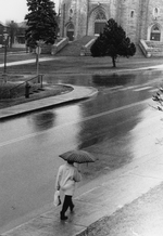 Description :EN HAUT DE LA PHOTO, LA FACADE D'UNE EGLISE. EN BAS, UNE PERSONNE MARCHE SUR LE TROTTOIR EN TENANT UN PARAPLUI AU DESSUS DE SA TETE.