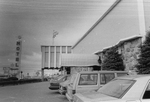Description :A GAUCHE, L'ANNONCE DU MOTEL DAUPHIN. A DROITE, LA FACADE DE L'EDIFICE OU IL Y A PLUSIEURS VOITURES STATIONNEES.