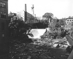 Description :VUE DU BARRAGE DERRIERE LA MANUFACTURE KAYSER, SUR LA RIVIERE MAGOG