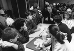Description :DENNIS WOOD SE TENANT AU BOUT D'UNE TABLE EN S'ADRESSANT A UN GROUPE D'ETUDIANTS AU COLLEGE DE SHERBROOKE.