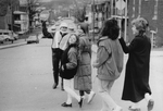 Description :PAULINE DOYON TIENT UNE PANCARTE OU IL EST ECRIT "ARRET", TANDIS QUE QUATRE JEUNES FILLES SE PREPARENT A TRAVERSER LA RUE GILLEPSIE.