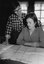 Description :LUCIE ST-AMAND EST ASSISE EN FACE D'UNE TABLE SUR LAQUELLE EST ETENDUE UN CARTE REPRESENTANT LE PLAN DE LA MINE SUFFIELD. MARCEL JOYAL SE TIENT DEBOUT DERRIERE ELLE.