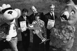 Description :DE GAUCHE A DROITE : YATOU, MASCOTTE DES DEPANNEURS PROPRIO, DENIS CARTER, DIRECTEUR PROMOTIONS ET PUBLICITE PROVIGO DISTRIBUTION, MYRIAM TISON, DIRECTRICE DE LA PROMOTION DU MAGAZINE LES DEBROUILLARDS, FELIX MALTAIS, DIRECTEUR DE L'AGENCE SCI...