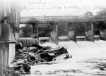 Description :VUE DU BARRAGE NO. 2 SUR LA RIVIERE MAGOG, SURMONTE D'UN PONT EN BOIS.