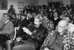Description :UNE FOULE DE PERSONNES DIVERSES SONT ASSISES ET QUELQUES UNES SONT DEBOUT A L'ARRIERE D'UNE SALLE.