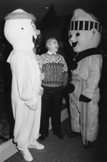 Description :A GAUCHE : UN BONHOMME CARNAVAL DE ROCK FOREST, AU CENTRE, SERGE MARTEL, ET A DROITE, UN BONHOMME CARNAVAL DE VALCOURT.