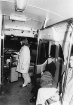 Description :VUE DE L'INTERIEUR D'UN AUTOBUS. UNE JEUNE FEMME A LA MAIN APPUYEE SUR LA BOITE DE PAIEMENTS. SUR LE SIEGE DE DROITE, UN JEUNE GARCON ET UN JEUNE HOMME SONT ASSIS. LA PORTE DE L'AUTOBUS EST OUVERTE.