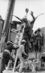 Description :DEUX HOMMES MUNIS D'UNE ECHELLE SONT EN TRAIN DE DETACHER L'ANGE DU CENOTAPHE ET LES TROIS SOLDATS QUI L'ACCOMPAGNENT.