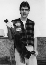 Description :DENIS LALIBERTE EST DEBOUT TENANT UN LIEVRE NOIR DANS SA MAIN GAUCHE. LE LIEVRE A LA TETE EN BAS.
