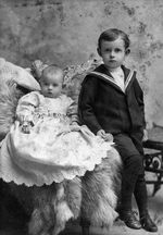 Description :PHOTO DE STUDIO. UN JEUNE BAMBIN (LENNOX) EST ASSIS SUR UNE CHAISE DE FOURRURE. IL PORTE DES VETEMENTS BLANCS. L'AUTRE ENFANT (MEREDITH) EST APPUYE SUR LA MEME CHAISE. IL PORTE DES VETEMENTS FONCES. IL Y A UNE PETITE TABLE EN ARRIERE A DROITE.