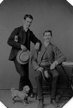 Description :UN HOMME DEBOUT (WELLS) ET UN HOMME ASSIS (WILSON). ENDIMANCHES, ILS TIENNENT LEUR CHAPEAU A LA MAIN. IL Y A DEUX CHIENS-JOUETS, UN SUR LE SOL ET L'AUTRE TENU PAR WELLS.