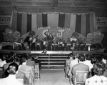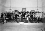 Description :PLUSIEURS DIZAINES DE PERSONNES SUR UNE SCENE. LE PIANO PORTE L'INSCRIPTION "H.C. WILSON & SONS". F.B. WILSON, 1ER VIOLONISTE, EST ASSIS A DROITE DU PIANO. TROIS TOILES SONT ACCROCHEES SUR LE MUR DU FOND. DEUX LUMINAIRES SONT SUSPENDUS. LE CHE...