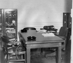 Description :UN BUREAU DE TRAVAIL EST ENTOURE A GAUCHE D'UNE ARMOIRE VITREE ET A DROITE, DE FILIERES. UN DICTAPHONE REPOSE SUR UNE PETITE TABLE PRES D'UN FAUTEUIL DE CUIR.