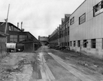 Description :VUE OUEST-EST D'UNE COUR ARRIERE DE LA RAND SERVANT D'AIRE DE RANGEMENT. A GAUCHE, L'EDIFICE #3 RELIE A L'USINE #2 PAR LA PASSERELLE - CAFETERIA.