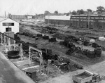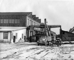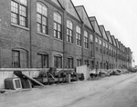Description :LA MACKINNON STRUCTURAL STEEL EST UN BATIMENT D'UN ETAGE OU 2. FENETRES A CARREAUX EN ARRONDI. A L'AVANT-PLAN, PIECES METALLIQUES PLACEES EN PAQUETS.