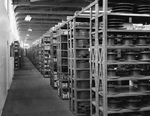 Description :18.1 - VUE D'ENSEMBLE DU MAGASIN, ENORME PIECE CONSTITUEE D'ETAGERES DE METAL SUR LESQUELLES DES PIECES METALLIQUES DE TOUTES FORMES SONT RANGEES. - 18.2 - VUE PARTIELLE MONTRANT LE CONVOYEUR QUI PERMET D'ENVOYER LES PIECES DEMANDEES.