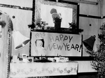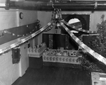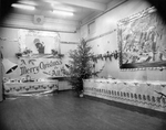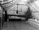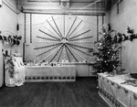 Description :DIFFERENTS PLANS DU DECOR DE NOEL DU PETIT THEATRE. DECOR CONSTITUE DE DEUX TABLES RECOUVERTES DE NAPPES ET SUR LESQUELLES SONT DISPOSES CARTES DE NOEL, BOUGIES, VERRES ET PICHETS. DEUX SAPINS DECORES, PHOTO DE LA RAND, FAUSSE CHEMINEE, CLOCHE...