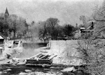 Description :VUE D'ENSEMBLE DU COMPLEXE DE LA RIVIERE MAGOG ET SES INSTALLATIONS HYDRO-ELECTRICQUES. AU PREMIER PLAN, BAIGNANT DANS LA RIVIERE, LES VESTIGES DES FONDATIONS DE LA ROYAL CORSET CO. A GAUCHE, LA CENTRALE DE LA "SHERBROOKE STREET RAILWAY". PUIS...