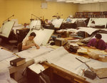 Description :VUE INTERIEURE DU BUREAU DU DEPARTEMENT DES INGENIEURS SOUS DEUX ANGLES DIFFERENTS. - 5.1 - VUE D'ENSEMBLE DU BUREAU OU QUELQUES TABLES A DESSIN SONT ALIGNEES. AU FOND A DROITE, UNE BIBLIOTHEQUE LONGE LE MUR. AU PREMIER PLAN, LES TABLES DE TRA...
