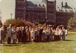 Description :GROUPE DE VOYAGEURS DE LA RAND PRENANT LA POSE. EN ARRIERE-PLAN, VUE DU PARLEMENT D'OTTAWA.