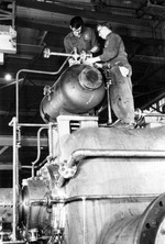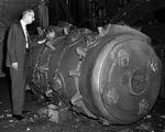 Description :M. EDWIN E. TEACH DANS DEUX BATIMENTS DIFFERENTS DE LA RAND. - 31.1 - VUE INTERIEURE DE LA FONDERIE OU M. TEACH REGARDE LA DOUBLURE DE 15" D'UN CYLINDRE TOUT JUSTE SORTI DU MOULE. - 31.2 - VUE INTERIEURE D'UNE SECTION DU BATIMENT #2 (L'ATELIER...