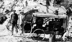Description :VUE DE DEUX CHANTIERS DIFFERENTS OU LA "LITTLE GIANT DRILL" EST UTILISEE. - 16.1 - AU PREMIER PLAN, LA PETITE PERFOREUSE MONTEE SUR UN TREPIED ET STABILISEE PAR DES POIDS, EST RELIEE A UN COMPRESSEUR PORTATIF. DERRIERE, UN BOISE ET UNE USINE E...