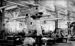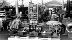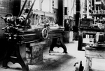 Description :VUE INTERIEURE DE L'ATELIER #2 OU UN TOUR A REVOLVER - TURRET LATHE - APPARAIT EN GROS PLAN. A NOTER A GAUCHE, LA COURROIE A TRACTION CENTRALE SERVANT A L'ACTIONNER. LE VOLANT, VISIBLE A L'AVANT ET AU CENTRE DU TOUR, SERT A FAIRE AVANCER MANUE...
