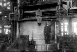Description :VUE INTERIEURE DE L'ATELIER #2. AU PREMIER PLAN, UN TAMBOUR DE TREUIL D'EXTRACTION EN COURS DE FABRICATION SUR UNE TOUR ET DEUX EMPLOYES PRENANT LA POSE NOUS DONNENT UNE IDEE DES PROPORTIONS DES MACHINES.