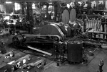 Description :VUE INTERIEURE DE L'ATELIER #2 OU APPARAIT UN TREUIL D'EXTRACTION MINIERE DE TYPE "PE-1" EN COURS DE FABRICATION. A NOTER A DROITE, LA PRESENCE D'UN EMPLOYE DEBOUT SUR UNE PLATEFORME.