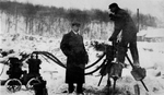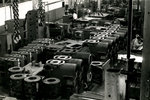 Description :VUE INTERIEURE D'UNE SECTION DE L'ATELIER #2. AU PREMIER PLAN APPARAIT UNE TOUR A OBUS DERRIERE LAQUELLE DEUX EMPLOYES PRENNENT LA POSE.