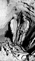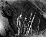 Description :DEUX EMPLOYES PRENANT LA POSE A L'INTERIEUR D'UNE MINE NON IDENTIFIEE, ENTOURANT DEUX PERFORATRICES A AIR COMPRIME JACK LEG. A NOTER, LES TUYAUX SERPENTANT SUR LE SOL.