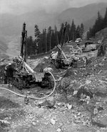 Description :VUE GENERALE D'UN CHANTIER INCONNU OU DEUX FOREUSES A CHENILLES "ECM-350 CRAWLAIR", RELIEES PAR DES TUYAUX A DES COMPRESSEURS D'AIR PORTATIF, SONT EN ACTION.