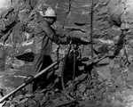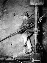 Description :VUE D'UNE SCENE DE TRAVAILLEURS S'AFFAIRANT A LA CONSTRUCTION D'UNE GALERIE DE MINES A L'AIDE DE DEUX PERFORATRICES "JR-38 STOPERS" RELIEES A DES TUYAUX D'ALIMENTATION EN AIR COMPRIME. A NOTER, LE SURPLUS DE MECHES APPUYEES CONTRE LE ROC.