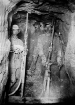 Description :VUE INTERIEURE DE LA MINE BEAVER MINE A COBALT, ONTARIO. AU PREMIER PLAN, DEUX MINEURS PRENNENT LA POSE AYANT EN MAINS, CHACUN UNE PERFORATRICE MANUELLE. AUTRE MINEUR A L'ARRIERE-PLAN.