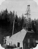 Description :VUE D'ENSEMBLE D'UNE INSTALLATION ABRITANT UNE "DEEP HOLE DRILL" A NEW GLASGOW, NOUVELLE-ECOSSE. A NOTER, LA PRESENCE D'UN TRAVAILLEUR DEBOUT SUR UNE PLATE-FORME A LA PARTIE SUPERIEURE DE LA TOUR.