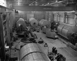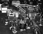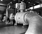 Description :L'INTERIEUR DE L'EDIFICE #2 SOUS DEUX ANGLES DIFFERENTS. - 47.1 - VUE D'ENSEMBLE DES INSTALLATIONS DE MISE A L'EPREUVE D'UN COMPRESSEUR CENTRIFUGE. A NOTER A DROITE, LE TUYAU D'EVACUATION SORTANT DU COMPRESSEUR. EMPLOYES ET DIRIGEANTS SEMBLENT...