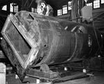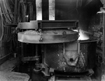 Description :VUE INTERIEURE DE LA FONDERIE ET EN GROS PLAN, UN FOUR ELECTRIQUE DE TROIS TONNES, LE COUVERCLE OUVERT, GLISSE VERS LA GAUCHE, PRET A ETRE RECHARGE. DEUX PUISSANTES ELECTRODES SONT DRESSEES A LA VERTICALE AU SECOND PLAN OU ELLES VOISINES DE NO...