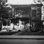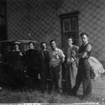 Description :GROUPE D'HOMMES DEVANT UNE RESIDENCE ET L'ARRIERE D'UNE AUTOMOBILE. IMMEUBLE A DEUX LOGEMENTS DE SIX PIECES CHACUN, SITUE AU 218 BOULEVARD ALEXANDRE (AUJOURD'HUI LE 1020). LE REVETEMENT EST CONSTITUE DE BARDEAUX D'AMIANTE EN LOSANGE. LE TOIT E...